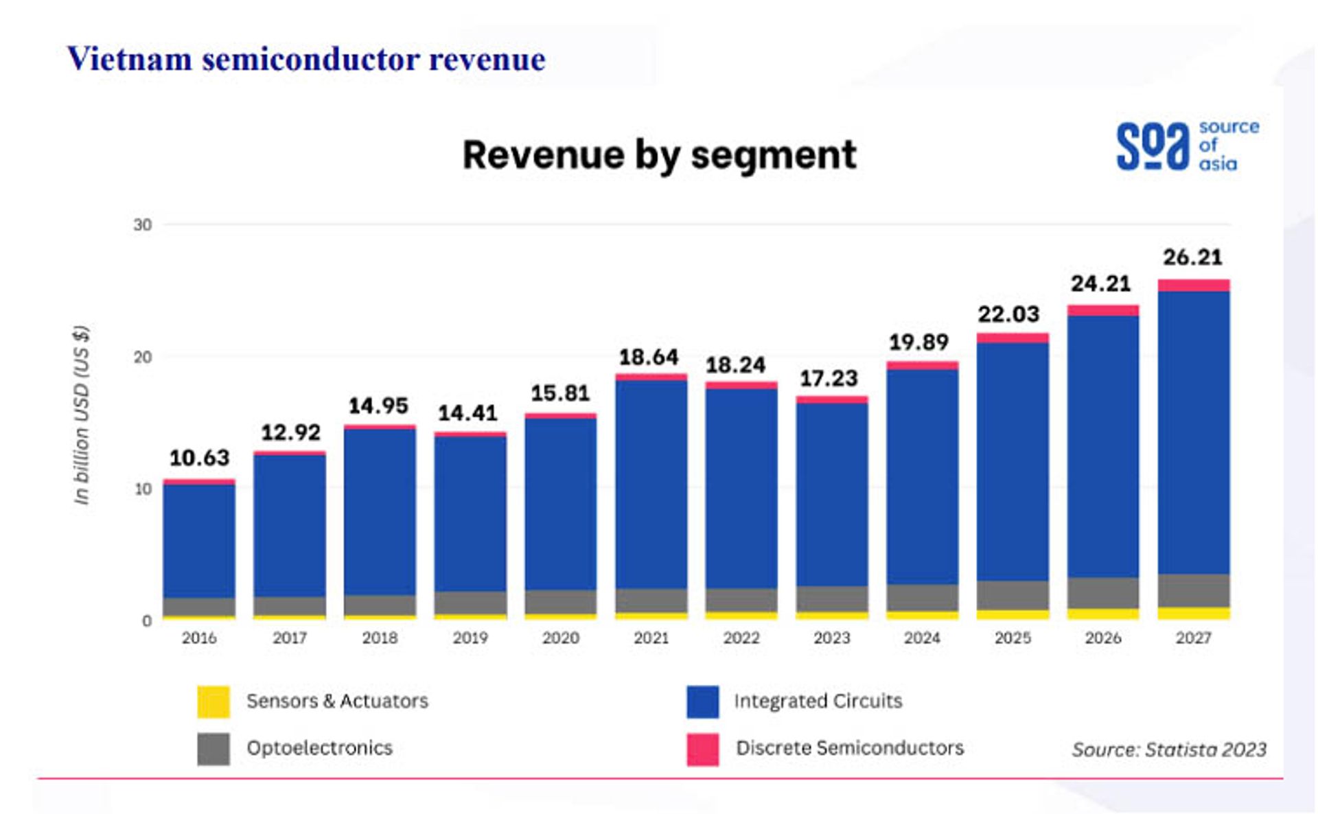 According to Guotai Junan Securities (Vietnam), Vietnam’s semiconductor revenue reached USD 17 billion in 2023 and is expected to grow at a CAGR of 11% between 2024–2027, reaching USD 31 billion by 2027—one of the highest growth rates in the region.