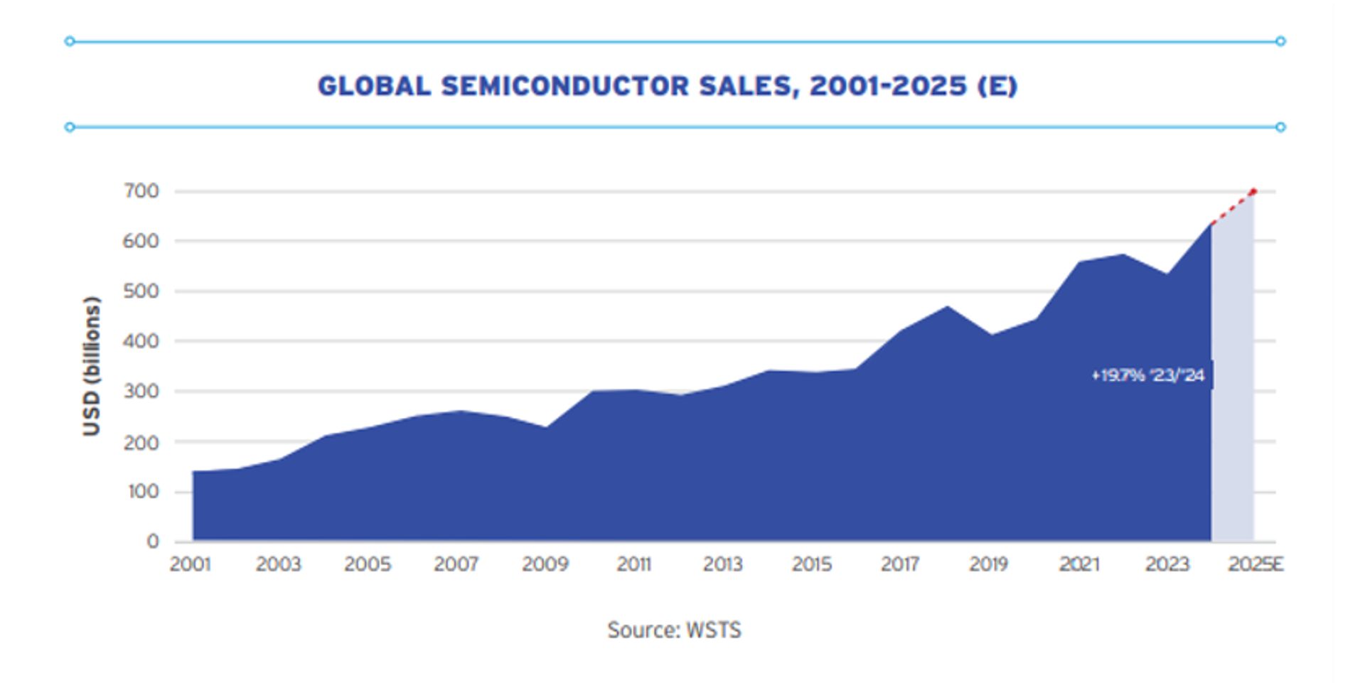 According to the Semiconductor Industry Association (SIA), global semiconductor revenue reached USD 630.5 billion in 2024 and is projected to rise to approximately USD 700 billion in 2025, representing an increase of 11.2%. PwC forecasts that the market could reach USD 1 trillion by 2030, with an average annual growth rate of 8–9%.